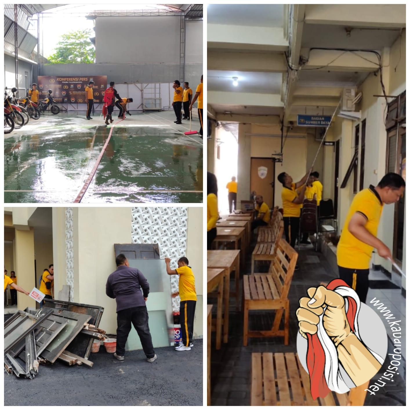 KABAROPOSISI.NET|Tulungagung – Personel Polres Tulungagung melaksanakan kegiatan kurve atau kerja bakti bersih-bersih di seputaran Mako Polres Tulungagung, mulai dari halaman, ruang kerja hingga ruang pelayanan masyarakat. Kegiatan serupa juga dilaksanakan oleh personel Polsek jajaran di wilayah masing-masing.