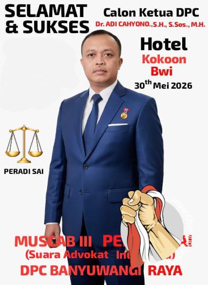 Kabaroposisi.net.|BANYUWANGI – Beredar kabar bahwa pelaksanaan Musyawarah Cabang (Muscab) Ke-3 DPC PERADI SAI (Perhimpunan Advokat Indonesia Suara Advokat Indonesia) Banyuwangi Raya akan digelar pada tanggal 30 Mei 2026 akan datang. Meski masih sekira 2 bulan lagi aroma kompetisi siapa-siapa yang akan jadi kandidat calon pemimpinnya sudah mulai menyebar.